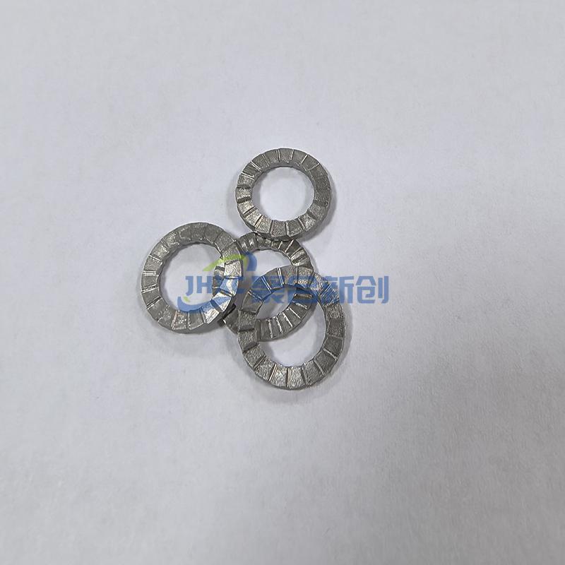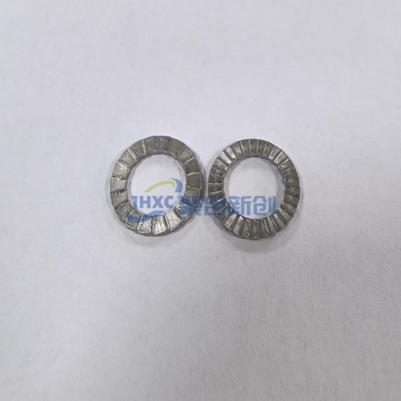 成对设计:由两片尺寸一致的带齿垫片组成;外侧为放射状凸纹面,内侧是斜齿面(斜角大于螺栓螺纹升角)